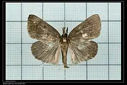 The wingspan is 33–35 mm. The ground colour of the wings is dark grayish brown. Adults are on wing in July.