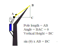 A pole is generally used to measure the remaining height of the tree. The climber pulls up an extendable pole and uses it to reach to the top of the tree from the point at the upper end of the tape. If not vertical, the slope of the leaning pole is measured and the length of the pole is measured. The vertical distance added by the pole to the tape length is (sin Θ x pole length).