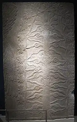 The Assyrian tree of life was represented by a series of nodes and crisscrossing lines. It was apparently an important religious symbol, often attended to in Assyrian palace reliefs by human or eagle-headed winged genies, or the King, and blessed or fertilized with bucket and cone.[5] Assyriologists have not reached consensus as to the meaning of this symbol. The name "Tree of Life" has been attributed to it by modern scholarship; it is not used in the Assyrian sources. In fact, no textual evidence pertaining to the symbol is known to exist.