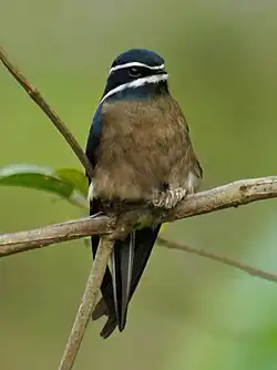 Treeswifts are small to medium-sized swifts, ranging in length from 15 to 30 cm. They have long wings, with most of the length coming from the length of the primaries; their arms are actually quite short. They visibly differ from the other swifts in matters of plumage, which is softer, and they have crests or other facial ornaments, and long, forked tails.[1] Anatomically they are separated from the true swifts by skeletal details in the cranium and palate, the anatomy of the tarsus, and a nonreversible hind toe that is used for perching on branches (an activity in which true swifts are unable to engage). The males have iridescent mantle plumage. They also have diastataxic wings, that is they lack a fifth secondary feather unlike swifts in the Apodini, which are eutaxic.[2][3]