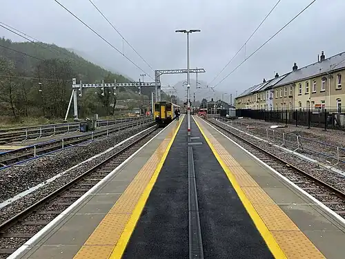 The service from this station was suspended from April 2023 to February 2024, due to major route upgrade work being carried out at multiple locations as part of the Valley Lines electrification scheme. A replacement bus service was in operation from here to Pontypridd, calling at all local stations.[7] Rail services resumed on 26 February 2024, ahead of the introduction of new rolling stock later in the year. A second platform and passing loop was added at this time.