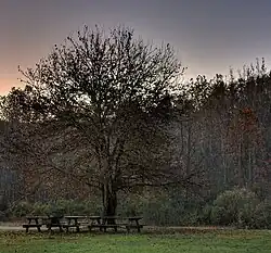 Robert H. Treman State Park is located along State Route 327, just west of state routes 13, 34, and 96. The park offers an outdoor swimming area at the base of a waterfall, picnic tables, playing fields, hiking and camping.