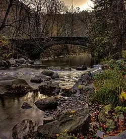 The valley and waterfalls formed since the last ice age — within the last twenty or thirty thousands years — roughly in-line with previous streambeds. However, around Lucifer Falls, the current streambed completely deviates from its now drift-filled interglacial streambed (where the creek flowed in-between periods of glaciation).[8] This path of new erosion is distinguished by its steep cliffs and narrow gorge.