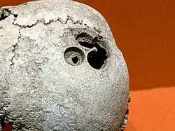 Its prevalence among Mesoamerican civilizations is much lower, at least judging from the comparatively few trepanned crania which have been uncovered.[6] The archaeological record is further complicated by the practice of skull mutilation and modification which was carried out after the death of the subject, in order to fashion "trophy skulls" and the like, of captives and enemies. This was a reasonably widespread tradition, illustrated in pre-Columbian art which on occasion depicts rulers adorned with or carrying the modified skulls of their defeated enemies, or of the ritualistic display of sacrificial victims. Several Mesoamerican cultures used a skull-rack (known by its Nahuatl term, tzompantli) on which skulls were impaled in rows or columns of wooden stakes.