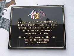 King has been commemorated in loyalist songs, annual parades, and murals. A memorial plaque and mural stands at the junction of Spier's Place and Shankill Road junction close to the spot where King was fatally wounded. It is dedicated to him, David Hamilton and William "Frenchie" Marchant, a leading UVF member gunned down by the IRA at the same location in 1987. On the gable of a house in Disraeli Street in the Woodvale area, King is featured on one of three outsized murals commemorating killed loyalist paramilitaries (a fourth at the start of the street commemorates the Woodvale Defence Association in general). His is the middle mural, flanked by those representing Brian Robinson and Sam Rockett, UVF men killed by the Force Research Unit and Ulster Defence Association respectively. Beside King's mural there is an inscription taken from Suicide in the Trenches, a poem written by Siegfried Sassoon in 1917. It reads: