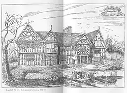 The earliest depiction of Trewern Hall is a print of the house by Thomas Edward Pryce, who visited the house in December 1883. In his description of the house he notes that the porch was "badly mutilated" and that inside and all decorative features had been removed.[1] The date 1610 and the initials R F also occur on a tie beam in the plainer kitchen wing to the east. The front of the house is nearly symmetrical with two outer gables with a hall between, the latter flanked by two-storeyed gabled wings. To the right is a porch with a lobby entrance to the hall and access to the kitchen wing. The main hall of the house had small square windows divided by moulded mullions at a high level in the room to an oriel window. In the exterior, the 17th-century timber framing consists of two upper courses of decorative quadrants, and a herringbone pattern. The house is also jettied on three sides on corbels, carved with figures and heads on the front.[2]