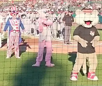 The ValleyCats have several mascots, the three most prominent being SouthPaw, his grandfather, Pappy, and his best friend, Ribbie. SouthPaw is a jersey-wearing cat, representing the "ValleyCat", the team's nickname. Another fan-favorite is Sammy Baseball who wears a patriotic costume and resembles Uncle Sam, reputedly derived from Samuel Wilson who operated a meat packing plant in Albany. The Tri-City Mayors, large caricature heads representing the current Mayors of Troy, Albany, and Schenectady, race (and dance) on a nightly basis at the ballpark. Ketchup, Mustard, and Relish mascots participate in a hot dog race. Other mascots include Spiedie the Chicken, Zoggy the Dinosaur, and Rowdy the River Rat, obtained when the Albany River Rats moved to Charlotte, North Carolina.[9]