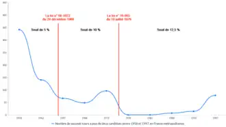 However, when comparing the evolution of the participation rate and the number of second rounds with more than two candidates during the legislative elections under the Fifth Republic, the correlation is far from obvious, as shown in the graph opposite.[9][16][25]