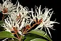 Flowers: Handsome flowers, nearly 4 cm in diameter, in loose axillary or terminal heads, are white tinged, becoming purple near the base, and closely resemble Hamamelis in shape. Petals are crinkly and long, to 2.5 cm, and at 4 cm in diameter are comparatively broad for this genus. Male and female parts are borne on separate flowers, either on the same specimen or different specimens (may be either monoecious or dioecious). Flowers from December to January.