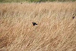 The tricolored blackbird nests in colonies, but scholars disagree on whether the costs outweigh the benefits of these breeding habits.[3] Nonetheless, nesting in colonies makes the tricolor susceptible to environmental changes. Although the tricolor has been able to adapt to some of the landscape changes, habitat loss played a major role in the reduction of its population.[4]