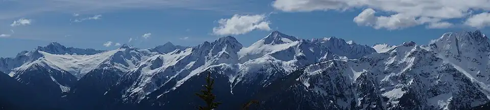 During the Pleistocene period dating back over two million years ago, glaciation advancing and retreating repeatedly scoured the landscape leaving deposits of rock debris.[6] The U-shaped cross section of the river valleys is a result of recent glaciation. Uplift and faulting in combination with glaciation have been the dominant processes which have created the tall peaks and deep valleys of the North Cascades area.