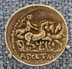 The name trigarium derives from triga, a three-horse chariot; compare the more common quadriga and biga, the four- and two-horse chariot.[10] In ancient Greece, three-horse chariots might be used for war, but are not known to have been raced.[11] The chariot of Achilles in the Iliad (16.152) was drawn by two immortal horses and a third who was mortal. In Etruscan racing, the third horse served as a trace horse on the inside of the turn, and was not yoked.[12] The Romans only rarely raced with a team of three.[13] Dionysius mentioned trigae races under Augustus, and they are also recorded in inscriptions for later periods.[14]