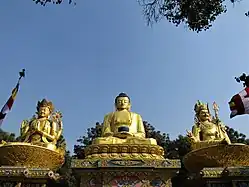 This concept posits that a Buddha has three distinct kayas or "bodies", aspects, or ways of being, each representing a different facet or embodiment of Buddhahood and ultimate reality.[2] The three are the Dharmakāya (Sanskrit; Dharma body, the ultimate reality, the Buddha nature of all things), the Sambhogakāya (the body of self-enjoyment, a blissful divine body with infinite forms and powers) and the Nirmāṇakāya (manifestation body, the body which appears in the everyday world and presents the semblance of a human body). It is widely accepted in Buddhism that these three bodies are not separate realities, but functions, modes or "fluctuations" (Sanskrit: vṛṭṭis) of a single state of Buddhahood.