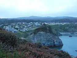 Trinidad (Spanish for "Trinity"; Yurok: Chuerey) is a seaside city in Humboldt County, located on the Pacific Ocean 8 miles (13 km) north of the Arcata-Eureka Airport and 15 miles (24 km) north of the college town of Arcata. Trinidad is noted for its coastline, with ten public beaches and offshore rocks, part of the California Coastal National Monument, of which Trinidad is a "Gateway City."[7] Fishing operations related to Trinidad Harbor are vital to both local tourism and commercial fishing interests in the region. Situated at an elevation of 174 feet (53 m) above its own North Coast harbor, Trinidad is one of California's smallest incorporated cities[8] by population, with 307 residents in 2020, down from 367 residents in 2010.