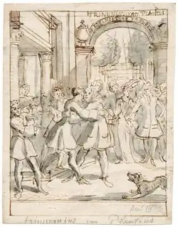 At this point Charmides suddenly arrives back and has an amusing conversation with the imposter. At first Charmides reproaches Callicles for buying up the house, but when Callicles explains everything Charmides is delighted. Lysiteles is allowed to marry Charmides' daughter, and Lesbonicus is betrothed to Callicles' daughter.