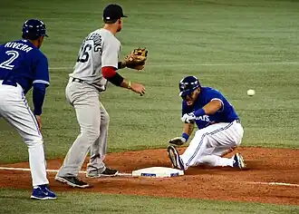 In baseball, a triple is the act of a batter safely reaching third base after hitting the ball, with neither the benefit of a fielder's misplay (see error) nor another runner being put out on a fielder's choice. A triple is sometimes called a "three-bagger" or "three-base hit".[1] For statistical and scorekeeping purposes it is denoted by 3B.[2][3]