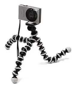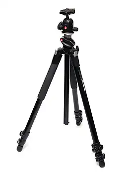In photography, a tripod is a portable device used to support, stabilize and elevate a camera, a flash unit, or other videographic or observational/measuring equipment. All photographic tripods have three legs and a mounting head to couple with a camera. The mounting head usually includes a thumbscrew that mates to a female-threaded receptacle on the camera, as well as a mechanism to be able to rotate and tilt the camera when it is mounted on the tripod. Tripod legs are usually made to telescope, in order to save space when not in use. Tripods are usually made from aluminum, carbon fiber, steel, wood or plastic.