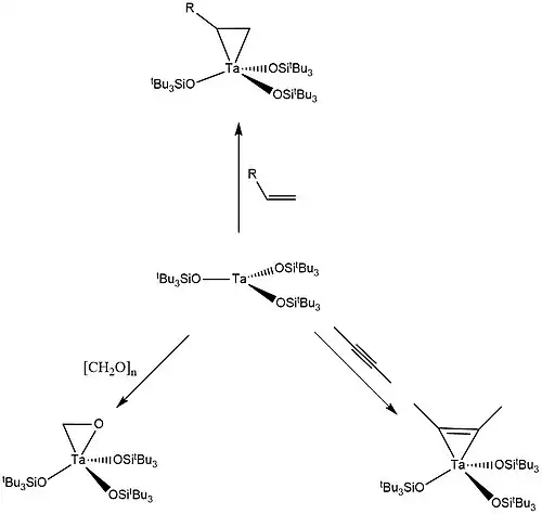 Tris(silox)tantalum tends to react with C-C and C-O π bonds oxidatively to form a Ta(V) center and two single Ta-C bonds or one single Ta-C and one single Ta-O bonds, respectively:[1]