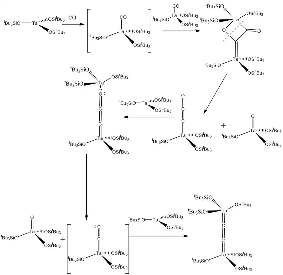 First, carbon monoxide adds to tris(silox)tantalum to form an unstable tetrahedral intermediate, which quickly dimerizes. Then, the cleavage of the four-membered ring as shown in the diagram results in the formation of the tris(silox)Ta=O and a ketenylidene species. This ketenylidene combines with tris(silox)tantalum which abstracts the termino oxo to form the transient vinylidene. Lastly, the vinylidene reacts with another tris(silox)tantalum to form the bridging dicarbide complex.
