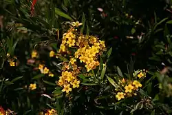 It is a small tree, with dense branching. The leaves are evergreen, opposite, simple, lanceolate, 5–9 cm long and 1 cm broad. The flowers are produced in dense clusters of 3–15 together; each flower is 1–1.5 cm diameter, with five small yellow petals and numerous conspicuous stamens.