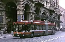 The overhead wires, however, were left intact, so as to allow for a possible future decision to reopen the system.[5] By 1985, it had been tentatively decided that trolleybus service in Bologna should be revived, with a new fleet of vehicles.[6] In 1988, orders were placed for a fleet of 20 new trolleybuses: 10 from Menarini and 10 from Breda.[7] It was decided that the first line of the reactivated system would be line 13, which was a union of the old lines 41 and 46, with some changes in the city centre portions to connect the two — in particular, new wiring along Via San Felice, Via Rizzoli, Via Santo Stefano and other streets for eastbound trolleybuses.[8] Line 13 would now be a cross-city radial line from Borgo Panigale to San Ruffillo via the city centre.[9] The long-disused overhead wires along former routes 41 and 46 were refurbished in preparation for a planned 1990 reopening. By spring 1990, delivery of both types of new trolleybuses had begun. A ceremonial "inauguration" event took place on 20 April 1990, in connection with a transport conference being held, with one trolleybus of each type running over a short section of the route that was temporarily energised for the occasion.[8]