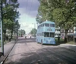 Grimsby's second trolleybus service began on 22 November 1936, running from Old Market Place to the borough boundary at Park Street. For nearly eight months, both trams and trolleybuses operated on the Riby Square to Park Street section, as the through tram service continued until Cleethorpes had installed their trolleybus wiring. The final trams ran on 17 July 1937, and the new joint trolleybus service between the towns began on the following day.[9] At the Cleethorpes end, the new route ran for a short distance beyond the Kingsway tram terminus to a turning loop at Bathing Pool. Cleethorpes ran their part of the joint service with vehicles also made by AEC, but unlike the Grimsby examples, they had two axles and rear entrances.[10]