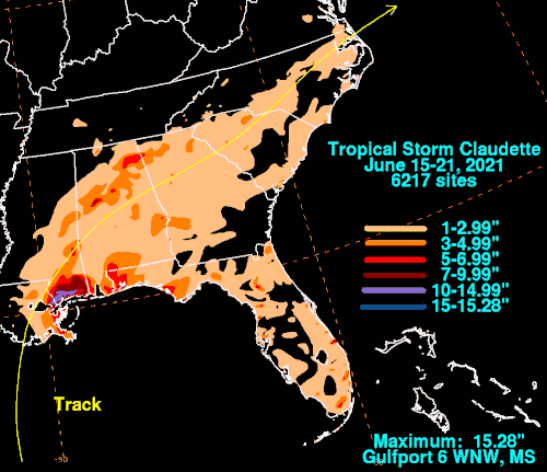 - ^ a b David Roth (August 25, 2021). "[Tropical Storm Claudette 2021 Rainfall Accumulations]" (.GIF). Weather Prediction Center. Retrieved August 26, 2021.