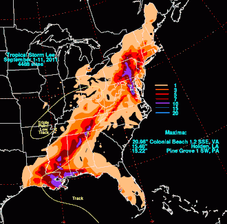- ^ a b c Harris, Bernard (September 9, 2011). "Lee dumps 7-15 inches of rain here". Intelligencer Journal. Archived from the original on June 9, 2012. Retrieved September 9, 2011.