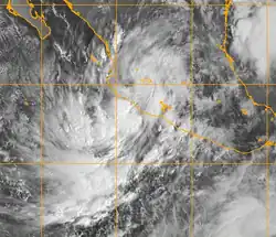 Extratropical cyclone, remnant low, tropical disturbance, or monsoon depressionA tropical wave moved off the coast of Africa on September 21, moving across the Atlantic Ocean and Caribbean Sea with little development. On October 1 it entered the eastern Pacific Ocean, and continuing westward it developed an area of persistent convection on October 5.[1] Initially the system was disorganized, although gradual development was expected as conditions in the upper-levels of the atmosphere were expected to become more favorable.[2] On October 7 it developed a broad low pressure area,[3] and by the next day it was located in the eastern portion of a large area of disturbed weather; the western portion of the system later developed into Tropical Storm Olivia. The eastern system developed organized convection near its center, and developed into Tropical Depression Fifteen-E at 0000 UTC on October 9, about 765 mi (1,231 km) southwest of the southern tip of the Baja California Peninsula.[1]