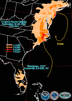 - ^ "Tropical Storm Ophelia (September 21-26, 2023) rainfall map". Tropical Cyclones in 2023. Weather Prediction Center. 2023-10-17. Retrieved 2023-10-18.