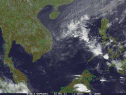 Later that same day, the JTWC assigned the system the designation 28W, noting a strong northeast surge was occurring with winds shifting from north-northeasterly to northerly, while Invest 98W, which had formed near the storm, rapidly weakened and was absorbed into the storm's southeastern periphery.[9] On 21:00 UTC, Pabuk showed deep convection flaring on the northwestern periphery of a low-level circulation that was mostly exposed.[10] On December 23, PAGASA issued its final advisory on Romina as it moved away from the Kalayaan Islands and lifted the wind signals.[11] On 03:00 UTC, the JTWC classified the storm intensity as high confidence, with a ridge steering the system west northwestward. A cold surge increased development.[12] On 06:00 UTC, the JMA upgraded the storm to a tropical storm and named it Pabuk, following the observation of a favorable environment as it moved westward along the southern periphery of a mid-level subtropical high.[13] On 09:00 UTC, the JTWC described the storm with a completely exposed low-level circulation center. Dry air also increased intensity.[14][15] On December 24, the JTWC noted that the storm had a marginally favorable environment which could quickly change.[16] On 06:00 UTC on December 25, Pabuk decreased into a tropical storm status because of an unfavorable environment, prompting the JMA to issue their final prognostic reasoning.[17]