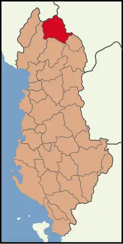 Tropojë District (Albanian: Rrethi i Tropojës, pronunciation: /tropɔɪə/) was one of the 36 districts of Albania, which were dissolved in July 2000 and replaced by 12 newly created counties. It had a population of 28,154 in 2001, and an area of 1,043 km2 (403 sq mi).[1] It was in the north of the country, and its capital was the town of Bajram Curri.[2] The area of the former district is coextensive with the present municipality of Tropojë, which is part of Kukës County. The area is known for its massive chestnuts forests and the river Valbonë, as well a rich folk culture.