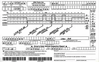 Keeping track of a driver's HOS requires the use of a log book.[63] A truck driver's log book is a legally defined form containing a grid outlining the 24-hour day into 15-minute increments. Drivers must specify where and when stops occur between driving shifts, what duties were performed (if any), along with the driver's name, truck number, company info, and other information. The driver must also present his or her log book to authorities upon request, for inspection. In lieu of a log book, a motor carrier may substitute an electronic on-board recorder to record the driver's hours.[64]