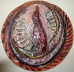 Trude Sojka's works are considered to be very special as well because of its technique. The artist used cement, a very hard material that dries fast, to make her paintings, the same way as she would make her sculptures, giving second dimension to the usually flat surface. She came up with the idea because she loved to work with clay, but cement was cheaper and more challenging. To fix the cement to the wooden or cardboard surface, she used a glue that her brother Walter Sojka, a chemist, invented just for her. Moreover, she was a pioneer in Ecuador, and probably in Latin America as well, to use recycled materials within her artworks, such as broken glass, pieces of metal, wheel structures, tiles, dustbin covers... Because she believed on the value of each little object, in the aftermath of the tremendous experience in the concentration camps, back in Europe. She covered the gray surfaces with acrylics instead of oils, much widely in use at the beginning of the fifties. Her artworks are thus very heavy and fragile because they can easily break.