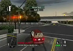 Driving missions can involve either trying to catch another car, escape from another car or tailing another car. At all times, when the player is in a car, their car's condition is shown on-screen. If the car's health meter empties, the car is close to destruction. When another car is involved, that car's health meter will also be shown on-screen.[16] When the player is tailing another car, a "Tail meter" will appear on-screen, with three sections and a moving arrow. If the arrow is in the top section, it means the player is too close and must slow down. If the arrow is in the bottom section, it means the player is losing the target and must speed up. As such, the player must try to keep the arrow in the middle section as much as possible.[17] During normal driving missions, the player can solve random crimes provided by the radio dispatcher.[18]