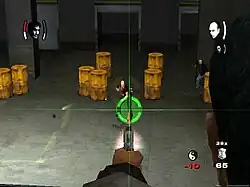 During shooting missions, the game auto-targets the closest opponent. If the player wishes to switch target to another opponent, they must do so manually.[12] When the player is in shooting mode, they can enter "Precision Targeting" at any time. At this point, the game switches to first-person, zooms in on the target, and goes into slow motion momentarily. While in Precision Targeting, if the reticle turns green, the player can hit the enemy with a neutralizing, non-lethal shot. If the player fires when the reticle is red, the enemy will be killed instantly.[13] Players can also take cover during shootouts, firing from behind cover when the opportunity presents itself.[13] Players are also free to pick up any weapons dropped by enemies. Once the ammo of these weapons is depleted, however, Kang will drop the weapon and revert to his standard issue revolver, which, although it needs to be reloaded, never runs out of ammo.[13]