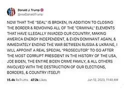 Donald Trump's formal campaign manifesto was Agenda 47. It took the form of a series of videos on his official website outlining his proposals one by one.[73] Seeing that the series was cut short in December 2023, Agenda 47 was primarily targeted to Republican voters during the 2024 primary season.[74][75] His website's homepage contained a list of 20 campaign proposals.[74]