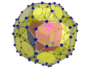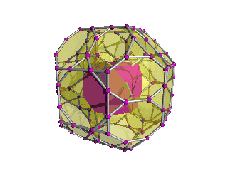 • Six cuboidal volumes join the square faces of this central truncated octahedron to the center of the octagonal faces of the great rhombicuboctahedron. These are the images of 12 of the cubical cells, a pair of cells to each image.