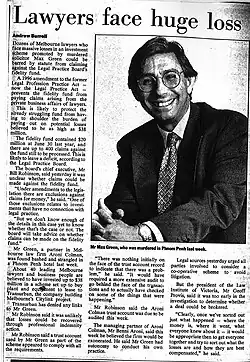A further Melbourne case was the murder of Max Green in Phnom Penh. Max Green was a partner in the law firm Aroni Colman. In the Max Green case the amount lost was estimated at $38 million, ostensibly the $38 million was for the purchase of plant and equipment to be then leased to Transurban. Transurban denied any knowledge of this leasing arrangement. Some of the clients of Mr Green who lost their money in this case were other solicitors.