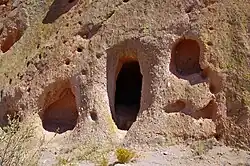 The ancient pueblo inhabitants of Tsankawi not only had a settlement on top of the mesa, but they built their homes along the base of the cliffs. They dug caves into the soft, tuff stone and extended the dwelling with walls made of talus rock mortared with mud. The roofs were made with timber and mud. These dwellings are called talus pueblos. 354 talus pueblos have been documented on Tsankawi Mesa, with most located at the boundary between the Tshirege and Otowi members of the Bandelier Tuff that forms the bedrock of the mesa.[2] Since the time that the talus pueblos were inhabited, the masonry walls have collapsed. The only remaining evidence is caves, or cavates, carved into the cliffs and socket holes which were used to support timber for the roofs. While they were not exposed to the elements, the caves are blackened from fires used for cooking and heat during the winter months. The talus pueblos were built on the south facing side of the mesas. During the winter months, the afternoon sun would warm the southern cliffs, melting the snow. However, the north-facing cliffs frequently had snow all winter long. The walls were plastered with clay, perhaps for aesthetic reasons, or to help prevent the walls from crumbling. Artwork along the walls can be seen in a number of the caves in the form of pictographs carved into the rock and painting remnants where clay still sticks to the walls.