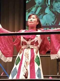 Between October 26 and November 3, Fujimoto took part in a tournament to crown the new Reina World Women's Champion. After defeating Rina Yamashita in the quarterfinals and Yako Fujigasaki in the semifinals, Fujimoto defeated Syuri in the finals to win the tournament and become the new Reina World Women's Champion.[189] She made her first successful defense of the title at an Ice Ribbon show on November 23 against Yuka.[190] She made her second successful defense back in Reina on December 26 against Maki Narumiya.[191] The following day, Best Friends won two more titles, when they defeated the Jumonji Sisters (Dash Chisako and Sendai Sachiko) for the Daily Sports Women's Tag Team and JWP Tag Team Championships.[192] On March 25, 2016, Fujimoto lost the Reina World Women's Championship to Makoto in her second defense.[193][194] On May 4 at Ice Ribbon's 10th anniversary event, Fujimoto wrestled in a special non-title tag team match, which featured the promotion's founder Emi Sakura wrestling her first Ice Ribbon match in over four years.[195] In the match, Fujimoto and Arisa Nakajima defeated Sakura and Nanae Takahashi with Fujimoto pinning Sakura for the win.[196][197] In June, Fujimoto made it to the finals of the 32-wrestler 2016 Catch the Wave tournament, but was defeated there by Ryo Mizunami.[198][199] On July 3, Fujimoto defeated Risa Sera to win the ICE×∞ Championship for the fifth time.[200][201] On August 14, Fujimoto and Nakajima lost the Daily Sports Women's Tag Team and JWP Tag Team Championships to Hanako Nakamori and Kyoko Kimura in their fourth title defense.[202][203] After four successful title defenses, Best Friends lost the International Ribbon Tag Team Championship to Hiragi Kurumi and Tsukushi on September 19.[204][205] After nine successful defenses, Fujimoto was stripped of the ICE×∞ Championship on November 3, after her defense against Tsukushi ended in a 30-minute time limit draw.[206][207][208] Fujimoto eventually made it to the finals of a tournament to crown the new champion, before losing to Risa Sera on December 31.[209] On June 25, 2017, Fujimoto defeated Manami Toyota and Tsukushi to win the Triangle Ribbon Championship for the third time.[210][211] Following the match, Toyota challenged both Fujimoto and Tsukushi to try to defeat her before her retirement from professional wrestling four months later.[210] On November 3, Fujimoto defeated Toyota in her retirement match, scoring the pin with Toyota's own Japanese Ocean Cyclone Suplex.[212][213]