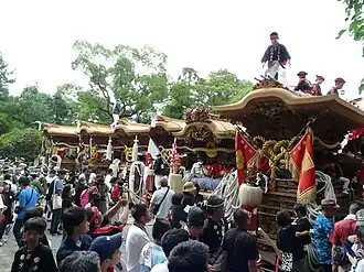 Danjiri are large wooden carts (danjiri guruma) in the shape of a shrine or temple. The carts, often being crafted out of wood, are very ornate, with elaborate carvings. Towns with danjiri festivals in them have different neighborhoods, each with their own guild responsible for maintaining their own danjiri cart. The cart is kept in storage for most of the year. As the festival approaches, the danjiri cart is prepared with elaborate flower arrangements, prayer cards, ornaments, and religious consecrations. They also make a special song every year. It is believed that spirits or gods reside in the danjiri. The person on the roof of the Danjiri cart controls the direction of movement and performs a traditional fan dance.[3]