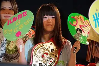 Tsukushi Haruka (春輝つくし, Haruka Tsukushi; born September 6, 1997)[1] is a retired Japanese professional wrestler. Trained by Emi Sakura, Tsukushi made her debut for her Ice Ribbon promotion in January 2010 as part of a trial series with Kurumi. After winning the fan voting, Tsukushi was made an official part of Ice Ribbon's roster the following March and she has since wrestled regularly for the promotion. She is a former one-time ICE×60 Champion, record ten-time International Ribbon Tag Team Champion and record three-time IW19 Champion. Tsukushi's accomplishments outside of Ice Ribbon include winning DDT Pro-Wrestling's Ironman Heavymetalweight Championship, JWP Joshi Puroresu's 2014 Tag League the Best and Reina Joshi Puroresu's Reina World Tag Team Championship.