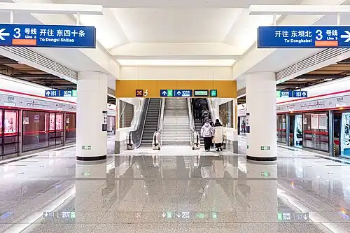 Tuanjiehu station[1] (simplified Chinese: 团结湖站; traditional Chinese: 團結湖站; pinyin: Tuánjiéhú zhàn) is a interchange station between Line 3 and Line 10 of the Beijing Subway. The Line 10 station opened on July 19, 2008. The station handled a peak entry and exit traffic of 80,700 people on May 5, 2013.[2] The Line 3 station opened on December 15, 2024.[3]