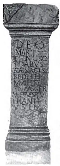 - ^ Attema, P. A. J.; Lanting, J. N.; Los-Weijns, M. A. (15 December 2008). Palaeohistoria 49/50 (2007/2008). Barkhuis. p. 701. ISBN 978-90-77922-44-6. Retrieved 13 December 2012. In Latin: 1. Deo / Marti / Thincso / et duabus / Alaisiagis / Bed(a)e et Fi/mmilen(a)e / et n(umini) Aug(usti) Ger/m(ani) cives Tu/ihanti / v(otum) s(olverunt) l(ibentes) m(erito). 2. Deo / Marti et duabus / Alaisiagis et n(umini) Aug(usti) / Ger(mani) cives Tuihanti / cunei Frisiorum / Ver(covicianorum) Se(ve)r(iani) Alexand/riani votum / solverunt / libent[es] / m(erito).