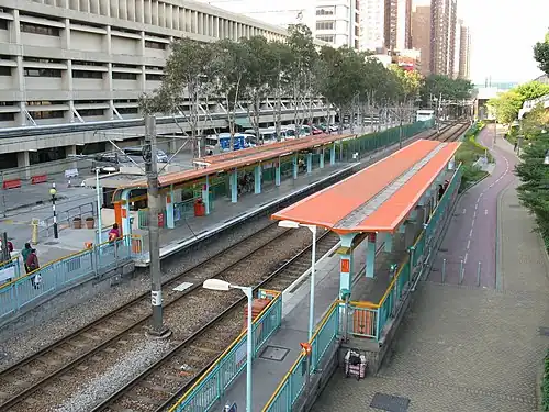 Tuen Mun Hospital (Chinese: 屯門醫院) is an at-grade MTR Light Rail stop located between Tuen Mun Hospital and Tuen Mun River in Tuen Mun District. It began service on 18 September 1988 and belongs to Zone 3. It serves Tuen Mun Hospital and nearby areas.[1]