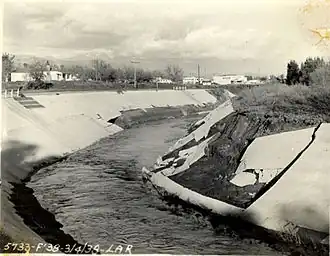 In 1969, there was a flood in the Tujunga Wash. Water flowed down a formerly inactive channel and entered a large gravel pit 15 to 23 m (49 to 75 ft) deep. The channel bed degraded by about 4 meters (13 ft), leading to the failure of three highway bridges and the loss of seven homes.[6]