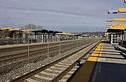 Construction of the permanent station was pushed back into 2013 to allow for further design development.[5] The $17 million construction contract was awarded to Absher Construction in April 2013,[61] and a ceremonial groundbreaking was held on June 24, 2013.[62][63] The west platform was demolished in August and replaced with a temporary platform to serve Sounder and Amtrak trains.[64] In June 2014, the RapidRide F Line began serving the station's newly completed bus bays, replacing local service on routes 110 and 140 between Burien and Renton.[65] The City of Renton completed its extension of Strander Boulevard to the station later in the month, connecting to the new park and ride on the west side of the platforms.[6][66][67] Following a four-week closure of the east platform,[68] both permanent platforms were re-opened in August 2014.[69] Construction of the permanent station reached substantial completion in December,[66] and the new station was dedicated by local dignitaries on February 18, 2015.[3][70] The east platform was built with additional width to be removed for a third track,[69] which was installed by BNSF in 2016.[71]