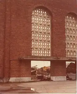 In its final configuration, the stadium included four concrete and steel sections (separated at the corners of the field), with a short steel upper deck wrapping around the sides and north end of the stadium. The press box was located on the western side of the field, and the main gate (pictured above) was at the southern end of the field facing Willow Street. The support structure for the upper deck was entirely open, exposing the ramps and lattice work, and hiding the original brick facade underneath with the exception of the Willow Street end of the stadium. Lights were installed in 1957.