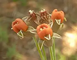 The flowers are small, trumpet-shaped, around 8 by 4 millimetres (0.31 in × 0.16 in) in size, and green, white, and orange-brown in colour.[3][2] Khaki colored flowers are surrounded by green, recurved tepals, and a fleshy orange to reddish-brown ring, with an umbel of around 2 to 6 flowers.[2] The flowers are sweet in scent, and the scent is particularly noticeable during the evening. The plant flowers throughout the year, mainly between the months of August to November, which is late winter to early summer in Southern Africa.[2] The plant can flower multiple times in a single season.[2]